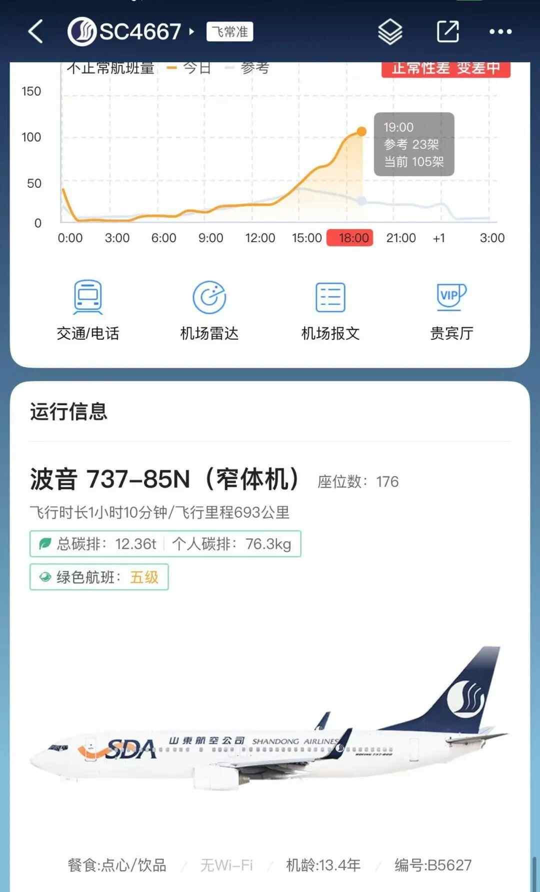 飞常准平台显示,SC4667航班当天15:22从青岛起飞,计划16:50抵达上海虹桥,结果16:26备降南京禄口国际机场。执飞该航班的为波音737机型,机龄13.4年。