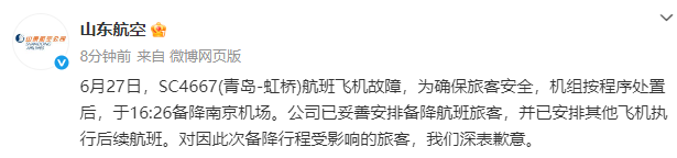 刚刚,山东航空通报:6月27日,SC4667(青岛-虹桥)航班飞机故障,为确保旅客安全,机组按程序处置后,于16:26备降南京机场。公司已妥善安排备降航班旅客,并已安排其他飞机执行后续航班。对因此次备降行程受影响的旅客,我们深表歉意。