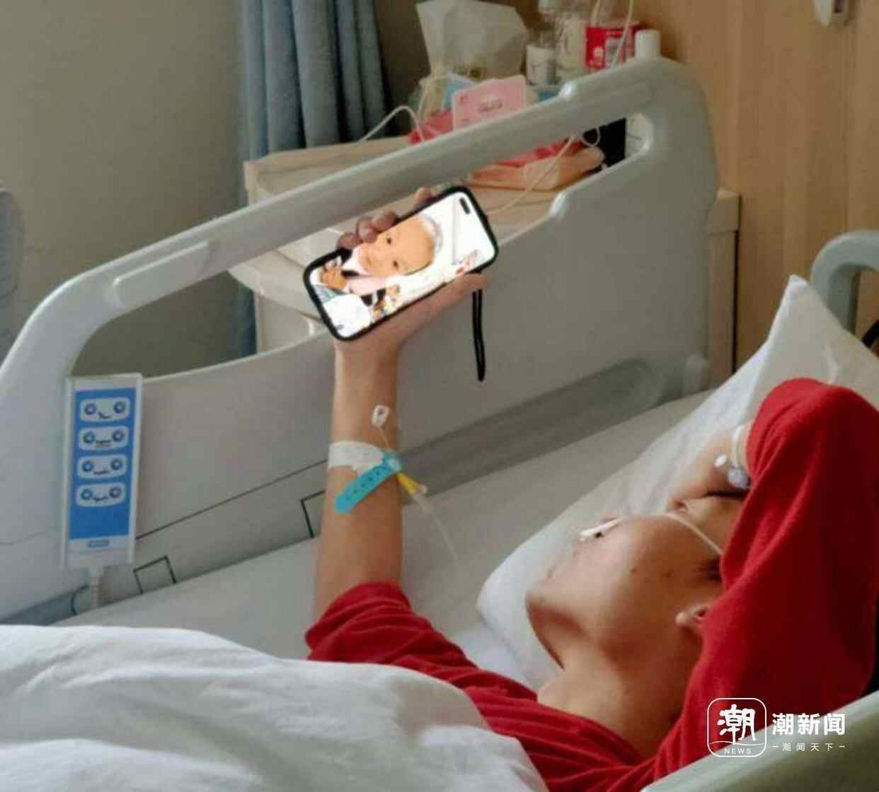 2021年2月,来杭州治疗的姚策,躺在病床上和儿子视频。记者 张蓉 摄