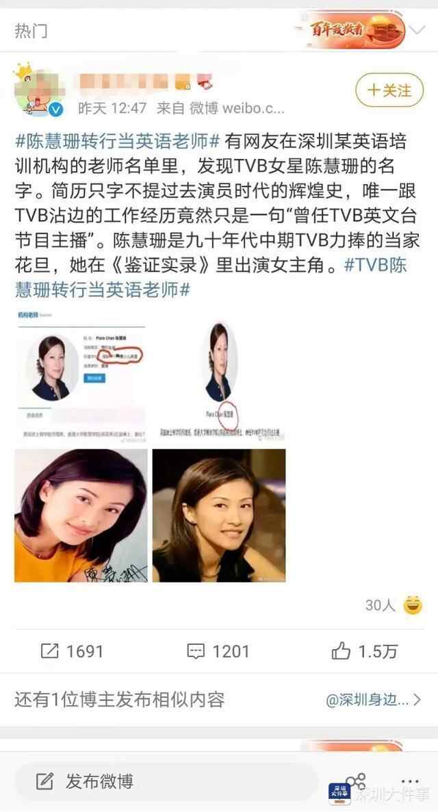 2021年,“陈慧珊转行当英语老师”的消息就一度引发网友关注。有网友发帖称在深圳一英语培训机构的老师名单里发现陈慧珊的名字,并被标注为“特约主讲”,专攻“青少儿英语教学”。