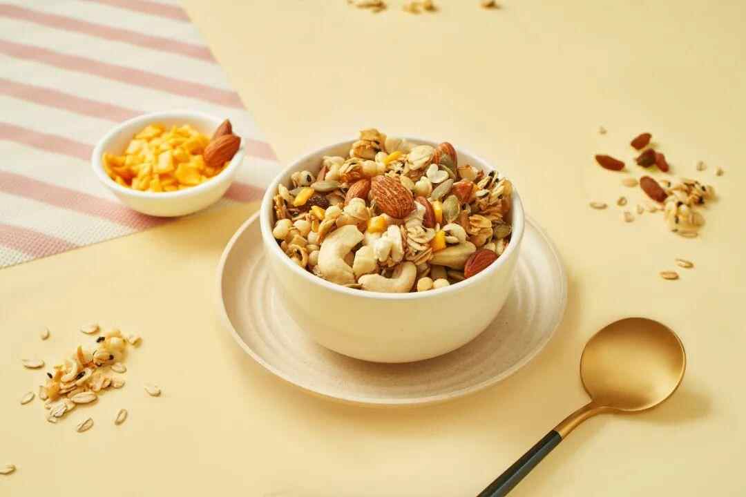 坚果麦片当中的营养价值相对较高,含有丰富的维生素、膳食纤维、蛋白质等营养成分,但同样的,坚果的油脂含量高、能量不容小觑。《中国居民膳食指南2022》中建议:坚果每周摄入量为50~70克,平均一天的摄入量为7~10克左右。