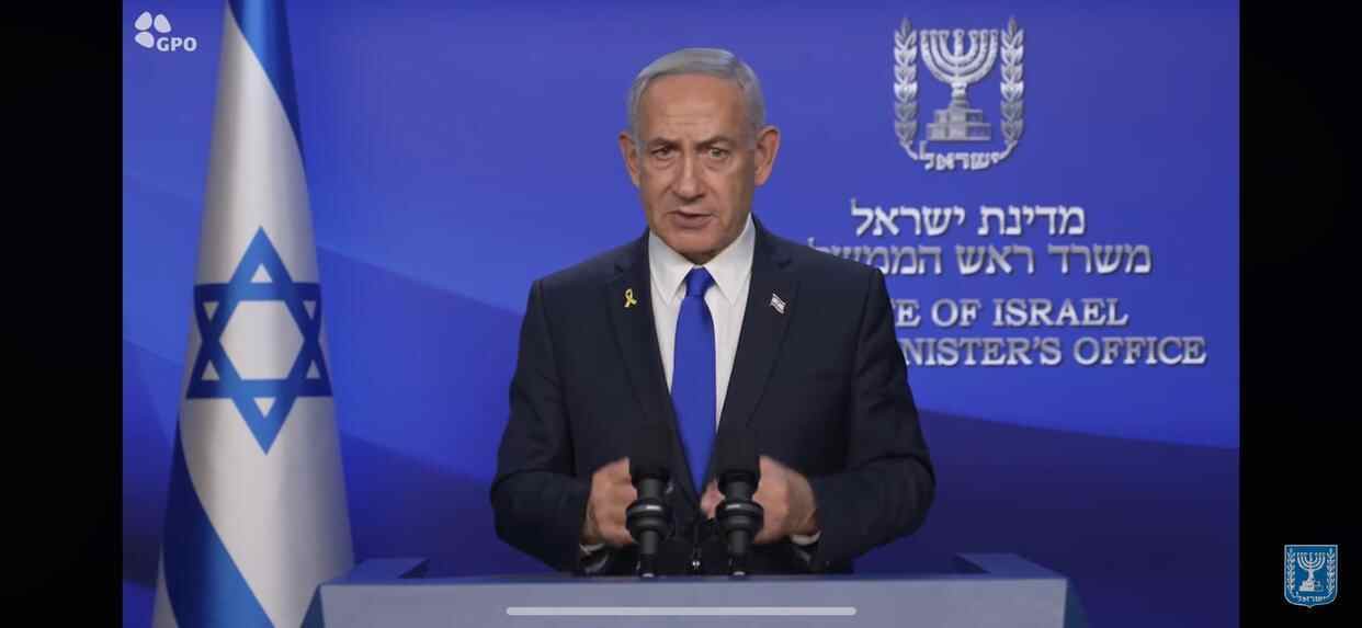 这张视频截图显示,6月13日,以色列总理内塔尼亚胡发表声明。新华社发 内塔尼亚胡声称,以色列13日以来对伊朗发动的“崛起之狮”行动“消除了(以色列)两大生存威胁:伊朗核武器威胁和伊朗2万枚弹道导弹威胁”。
