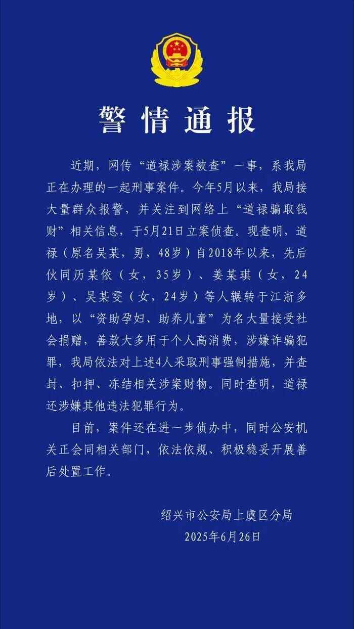 今年5月以来,警方接大量群众报警,并关注到网络上“道禄骗取钱财”相关信息,于5月21日立案侦查。现查明,道禄(原名吴某,男,48岁)自2018年以来,先后伙同历某依(女,35岁)、姜某琪(女,24岁)、吴某雯(女,24岁)等人辗转于江浙多地,以“资助孕妇、助养儿童”为名大量接受社会捐赠,善款大多用于个人高消费,涉嫌诈骗犯罪,警方依法对上述4人采取刑事强制措施,并查封、扣押、冻结相关涉案财物。