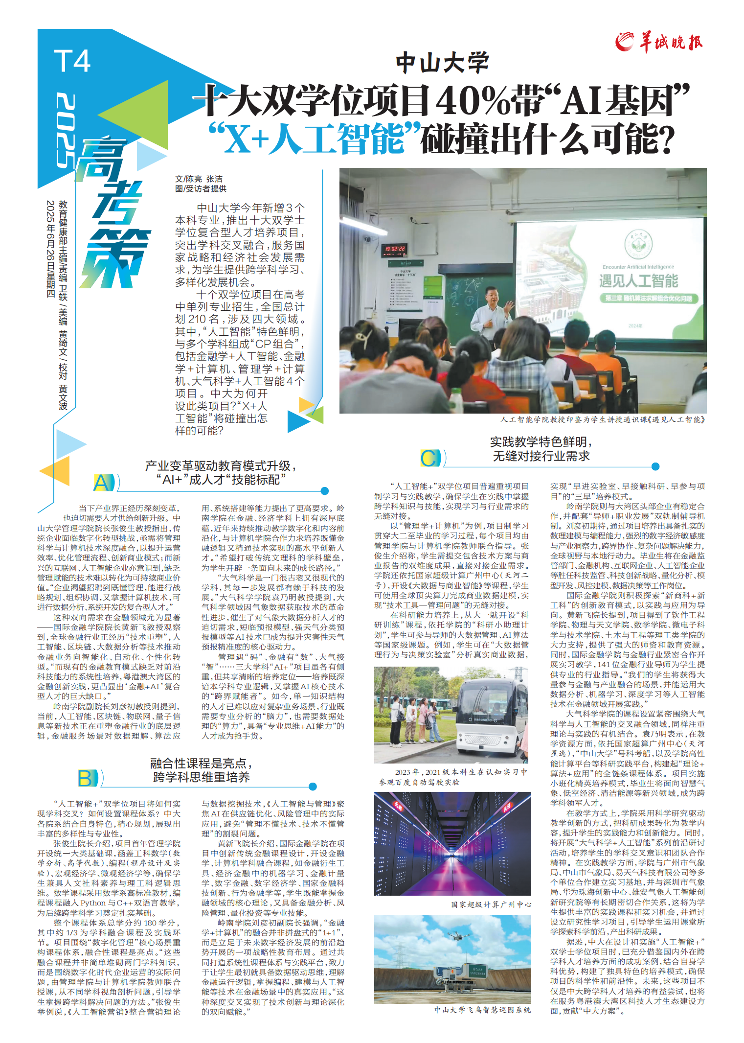 记者了解到,中大促交叉就是要培养数智时代的跨学科拔尖创新人才,以“人工智能+”交叉学科群建设为支撑,以“人工智能+”科研创新为牵引,继续增设“人工智能+”交叉专业和微专业,开设人工智能双学位项目,培养熟练掌握人工智能,具备多学科交叉背景的拔尖创新人才。今年中大系列举措,也为“人工智能+”双学位项目的开展奠定坚实基础。