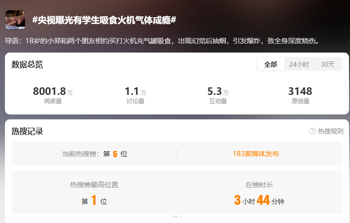 6月26日,#央视曝光有学生吸食火机气体成瘾#冲上热搜。