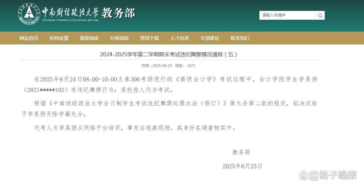 6月25日,在该校官网上看到了一则通报:在2025年6月24日08:00-10:00文泰306考场进行的《高级会计学》考试过程中,会计学院学生李某扬(2021*****102)有违纪舞弊行为:委托他人代为考试。