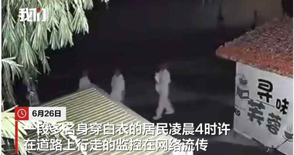 6月26日,一段多名身穿白衣的居民凌晨4时许在道路上行走的监控在网络流传。