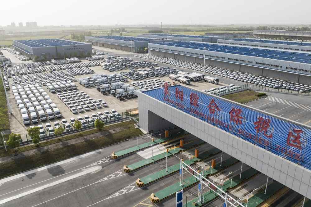 2025年4月23日,在湖北省襄阳综合保税区内,一批汽车等待出口(无人机照片)。新华社记者 伍志尊 摄