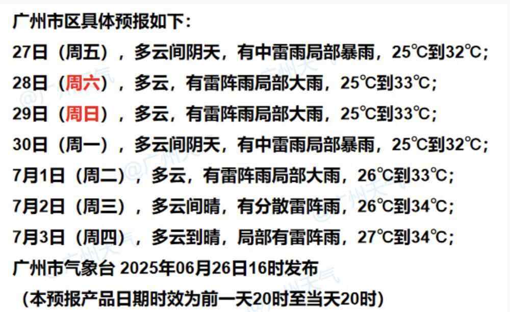 广州市气象台26日预计,27日广州有中雷雨局部暴雨,预计28日至7月1日,受高空波动和副高边缘偏南气流影响,广州雷雨仍频繁,局部雨势较大,雷雨间歇时段天气仍然闷热。展望7月2日起,副热带高压逐渐加强控制,广州天气又趋炎热。预计广州市区最高气温,将从27日至30日间的32℃~33℃,逐渐升至7月1日至3日的33℃~34℃。