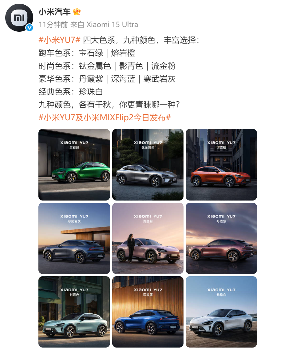 据悉, 小米YU7共有9种配色,分别是:宝石绿、熔岩橙、钛金属色、寒武岩灰、流金粉、珍珠白、深海蓝、丹霞紫、影青色。