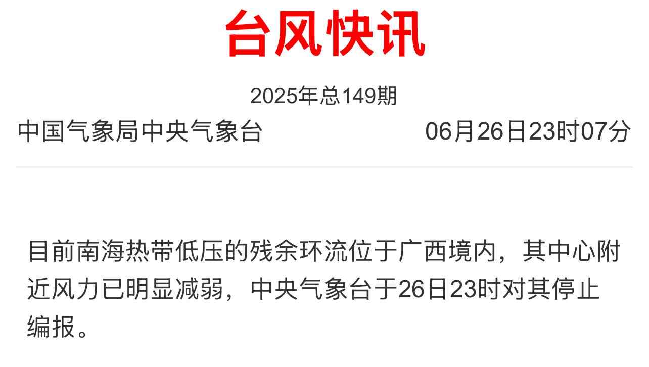 根据中央气象台观测,曾在26日凌晨登陆海南文昌,26日上午登陆广东湛江徐闻的南海热带低压,截至26日晚中心已进入广西。因其中心附近风力已明显减弱,中央气象台于26日23时对其停止编报。