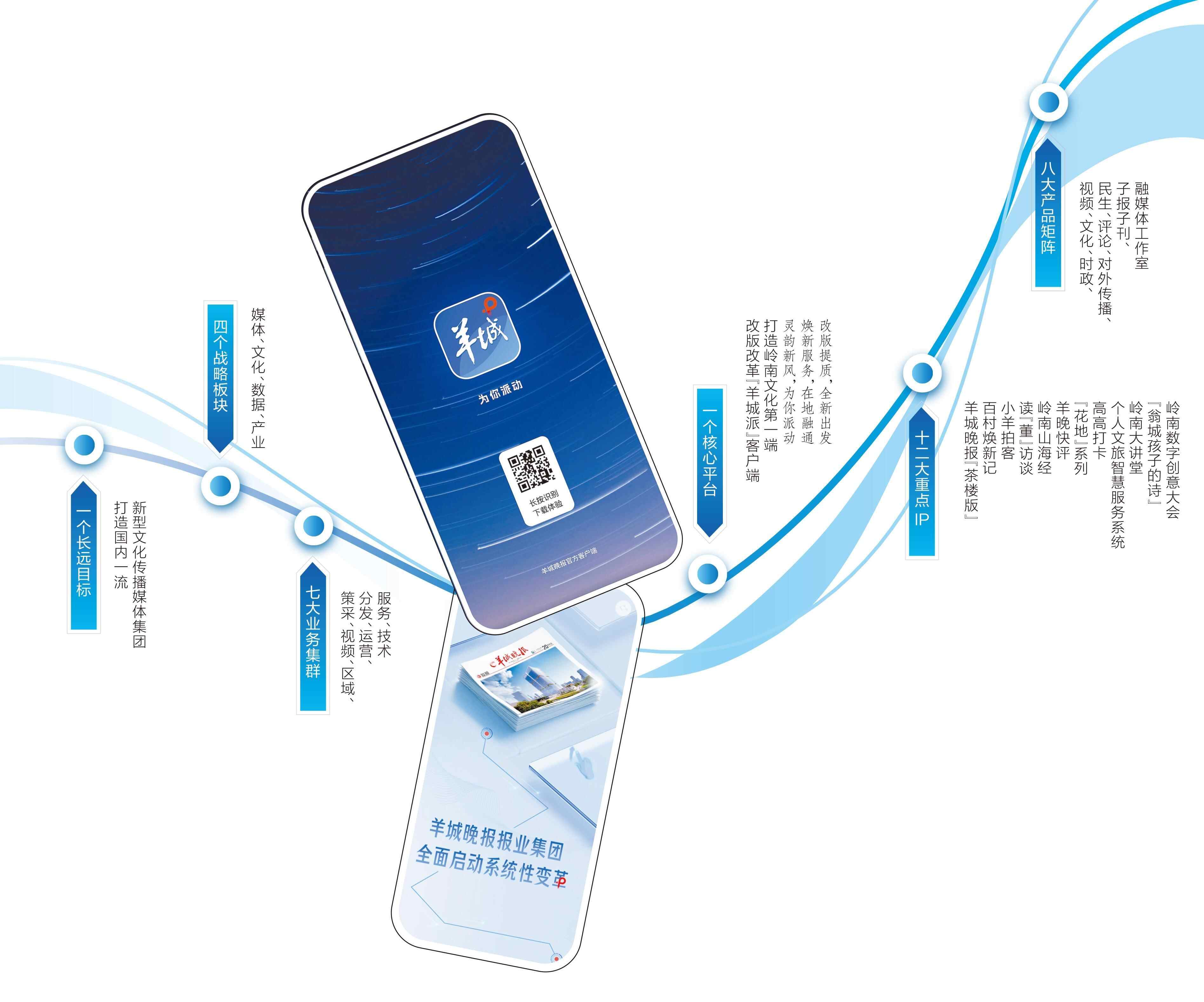 羊城晚报报业集团立足文化大报,以做强媒体、文化、数据、产业四个战略板块为重点,布局一个核心平台、七大业务集群、十二大重点IP、八大产品矩阵,深化体制机制改革,强化优质内容供给,优化媒体矩阵布局,加强先进技术赋能,加快全媒体人才队伍建设,实施以“羊城派”为中心的系统性变革,有效提升新闻影响力、舆论引导力、视觉传播力、队伍战斗力、“媒体+”融合力,更好担负起新的文化使命,奋力打造国内一流新型文化传播媒体集团。