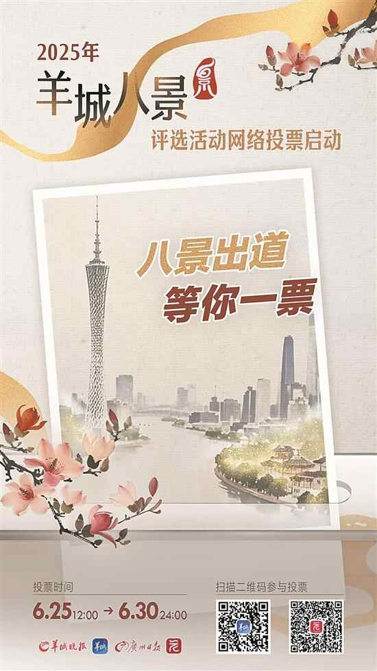 答:此次评选活动坚持“人民城市人民评”的理念,通过“线上投票+市民参与+专家评审”的方式,评选2025年“羊城八景”。网络投票将是评选“羊城八景”的重要参考,您的宝贵一票将影响评选结果。