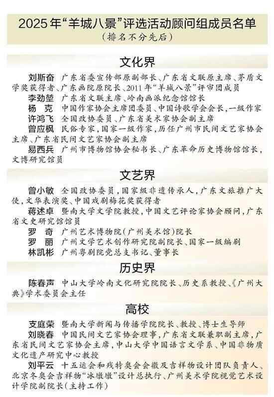 除了网络投票,专家评审得分也是评选2025年“羊城八景”的重要依据。在网络投票启动的同时,活动组委会同步向社会公布了评选活动顾问组、评审组成员名单(详见下表)。