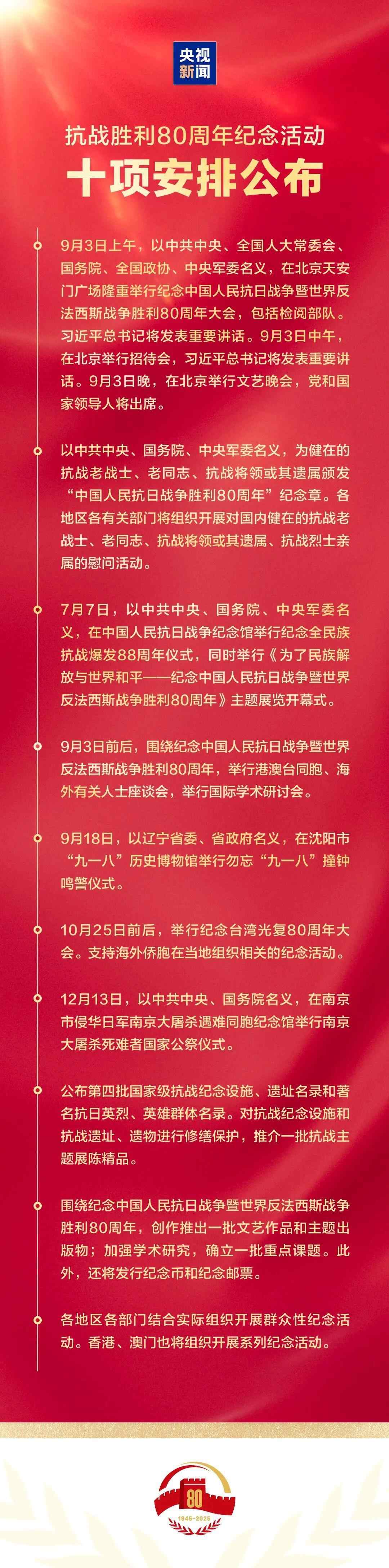 今天上午,国新办举行新闻发布会,介绍了纪念活动总体安排。主要的活动安排,共有十项。习近平总书记将出席纪念中国人民抗日战争暨世界反法西斯战争胜利80周年大会并发表重要讲话。