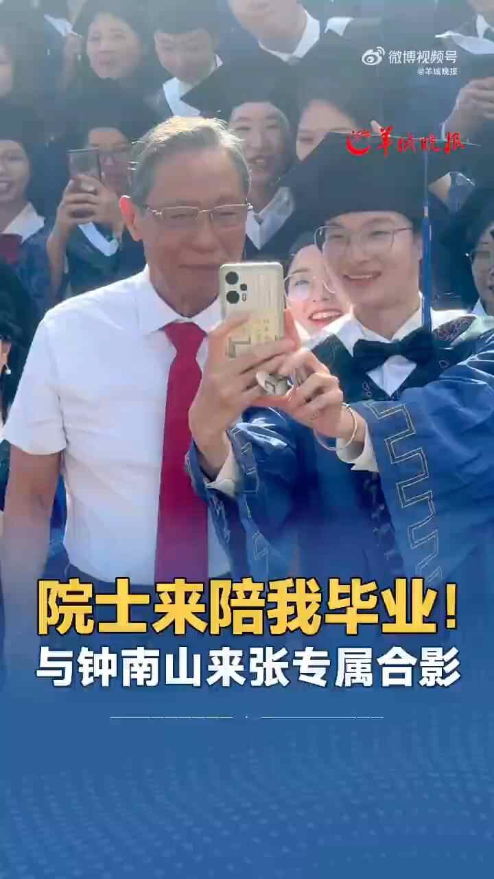 6月25日,广州医科大学在番禺校区举行毕业典礼,中国工程院院士钟南山到场与本硕博毕业生合影。前排同学抓住机会获得与院士“专属自拍”。