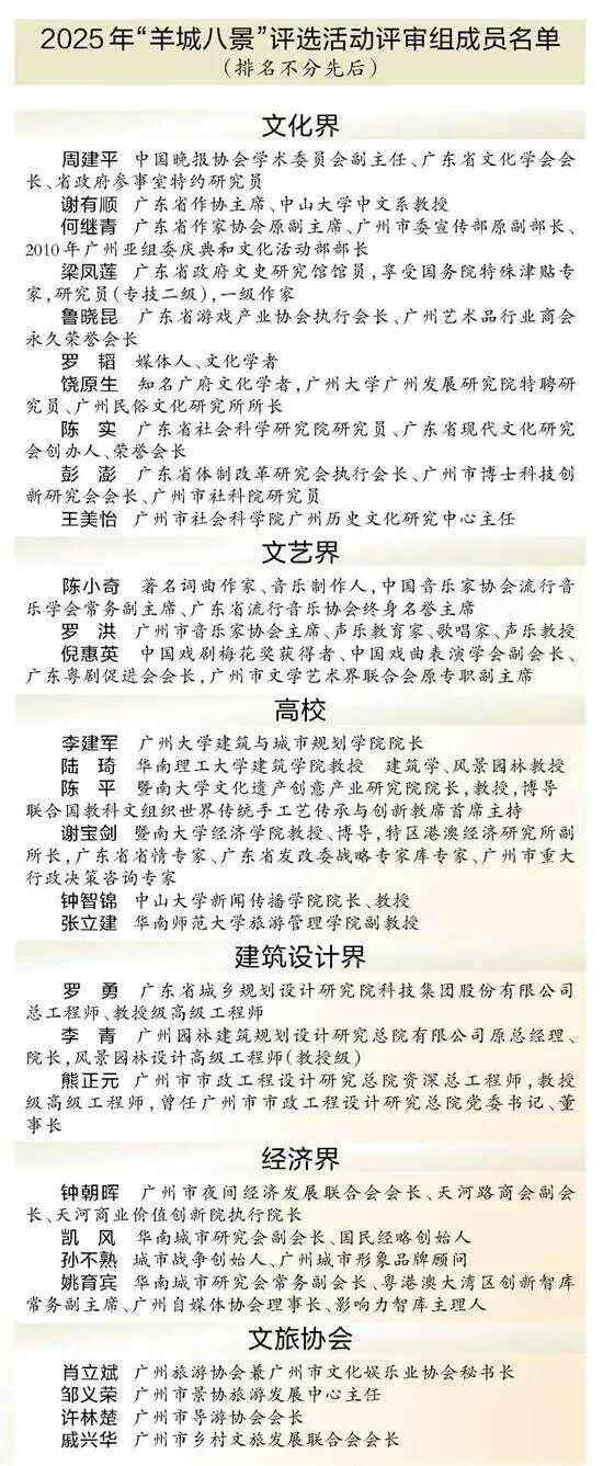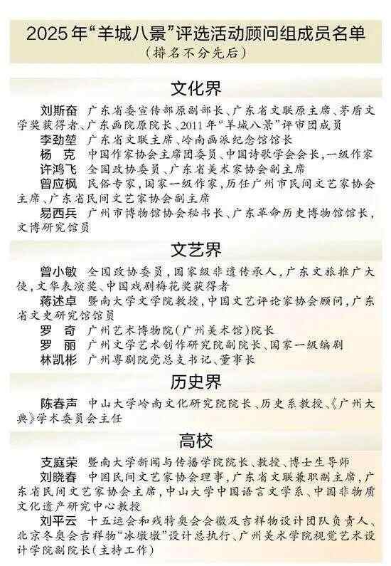 除了网络投票,专家评审得分也是评选2025年“羊城八景”的重要依据。在网络投票启动的同时,活动组委会同步向社会公布了评选活动顾问组、评审组成员名单(详见下表)。