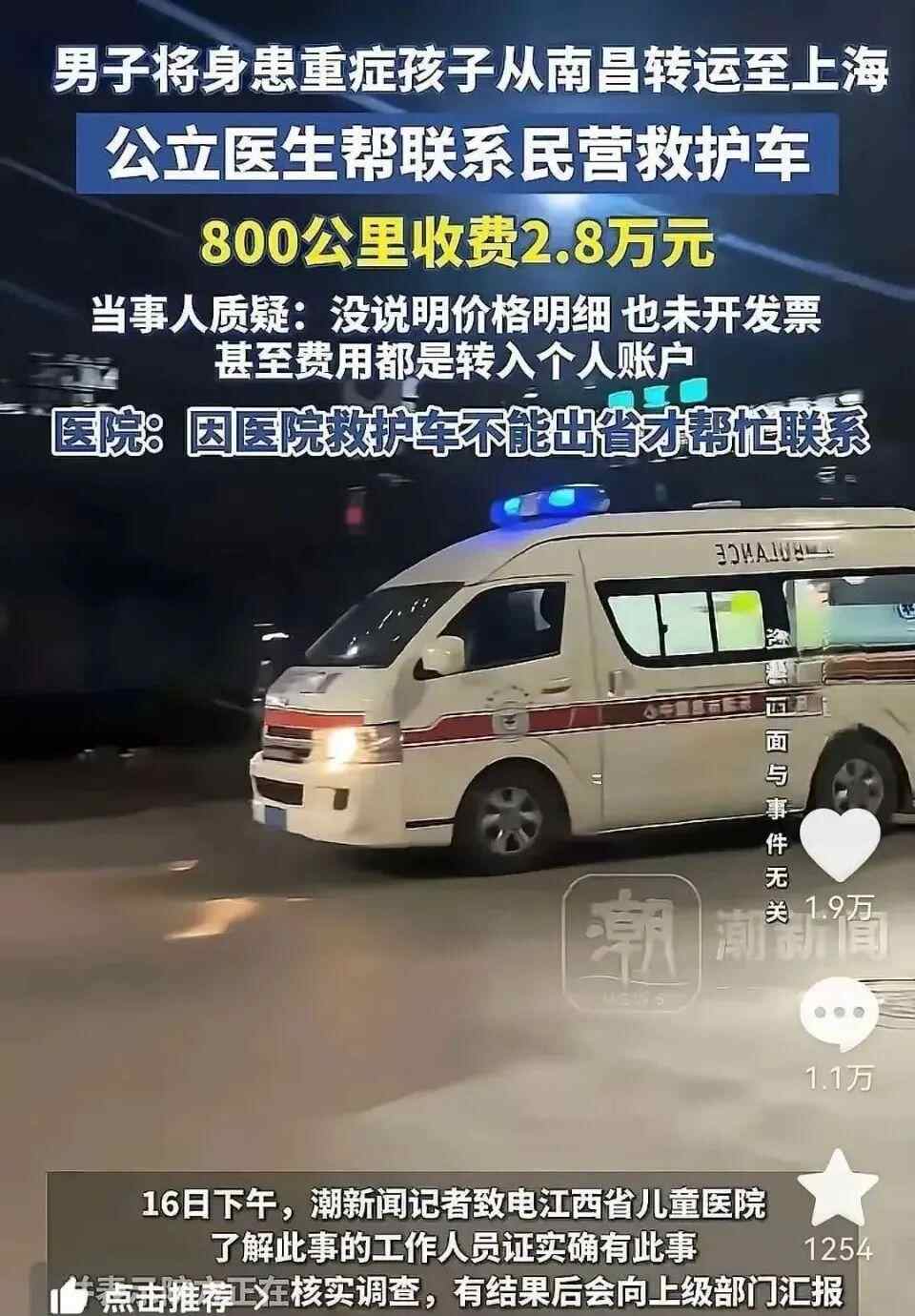 近日,“从江西省儿童医院转运至上海某医院,800公里路程被收2.8万元”的消息引发热议。