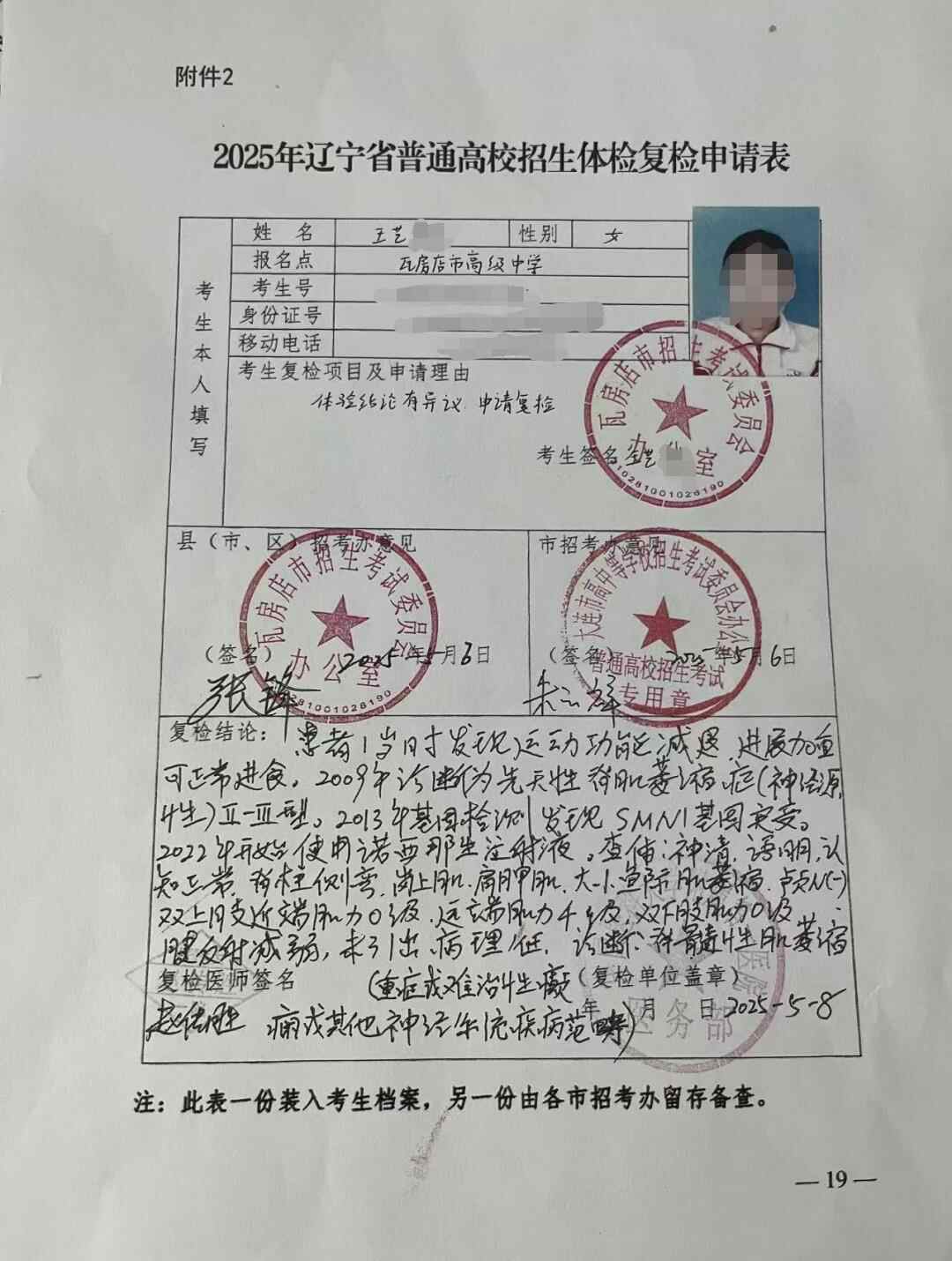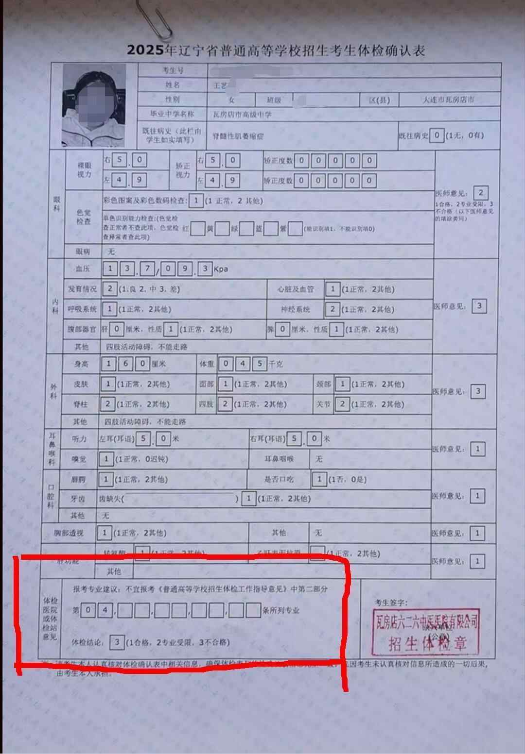 2025年4月,王艺在高考前体检时,被列为不合格。王先生提供的体检确认表显示,“不宜报考《普通高等学校招生体检工作指导意见》(下称《意见》)中第一部分第04条所列专业”,体检结论为“不合格”。极目新闻记者查阅《意见》发现,该条款明确规定:患有下列疾病者,学校可以不予录取,包括重症或难治性癫痫或其他神经系统疾病;严重精神病未治愈、精神活性物质滥用和依赖等。王艺所患脊髓性肌萎缩症正在相关条款范畴内。