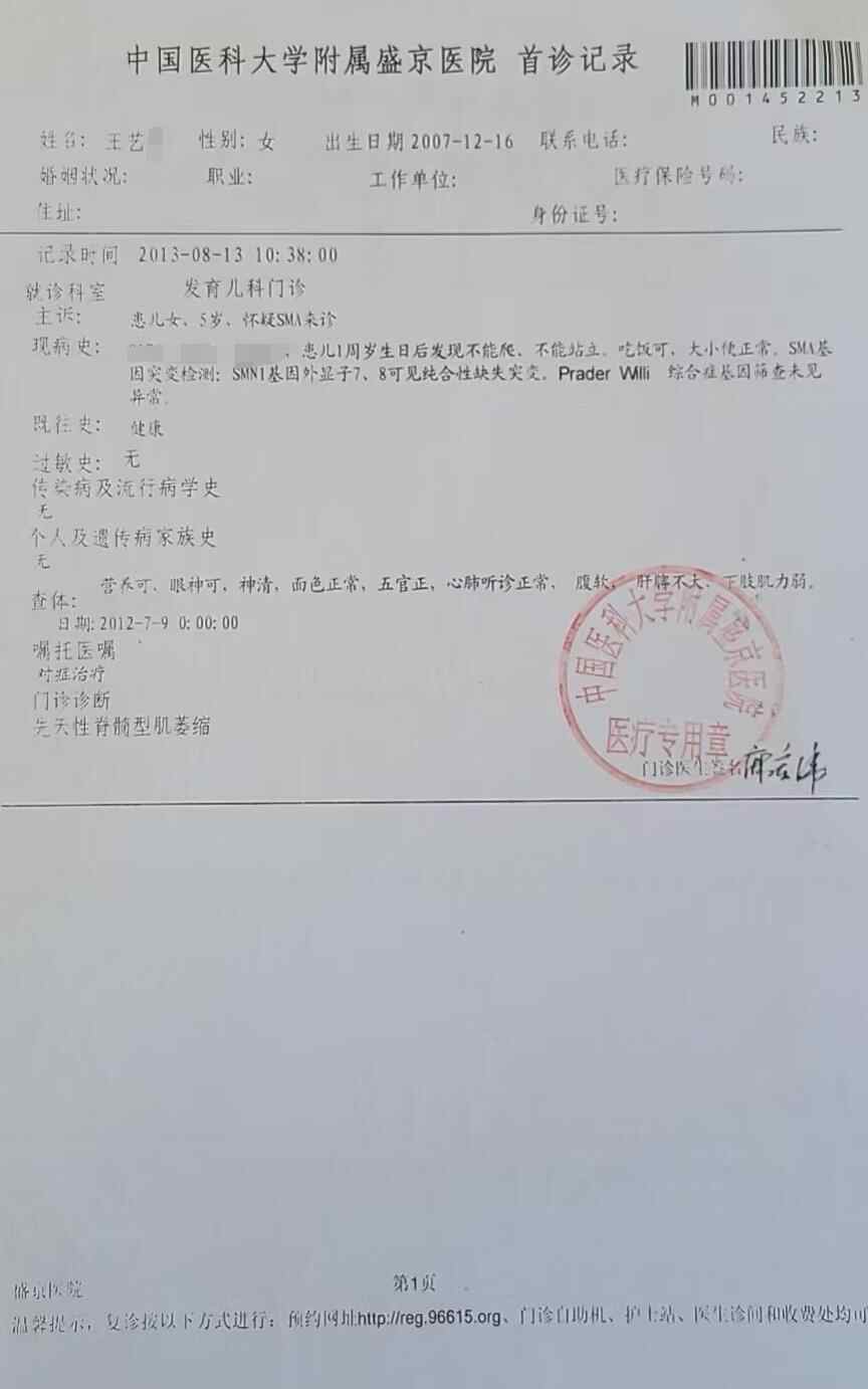 王先生告诉记者,其女儿王艺(化名)一岁时,两条胳膊无法抬动,双腿无法站立行走。当年,经中国医科大学附属盛京医院诊断,王艺双胫前肌、右股四头肌呈神经源性损害,确诊脊髓性肌萎缩症(神经源性)Ⅱ型-Ⅲ型。