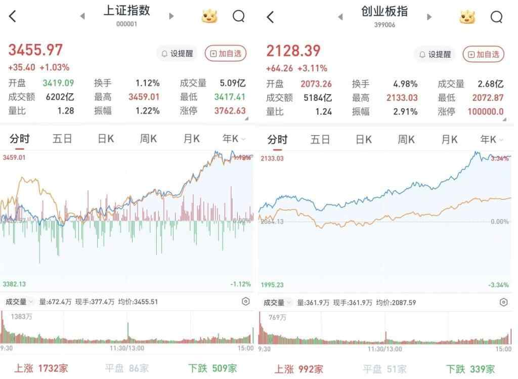 至收盘,上证综指涨1.04%,报3455.97点;科创50指数涨1.73%,报995.61点;深证成指涨1.72%,报10393.72点;创业板指涨3.11%,报2128.39点。