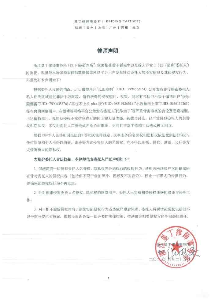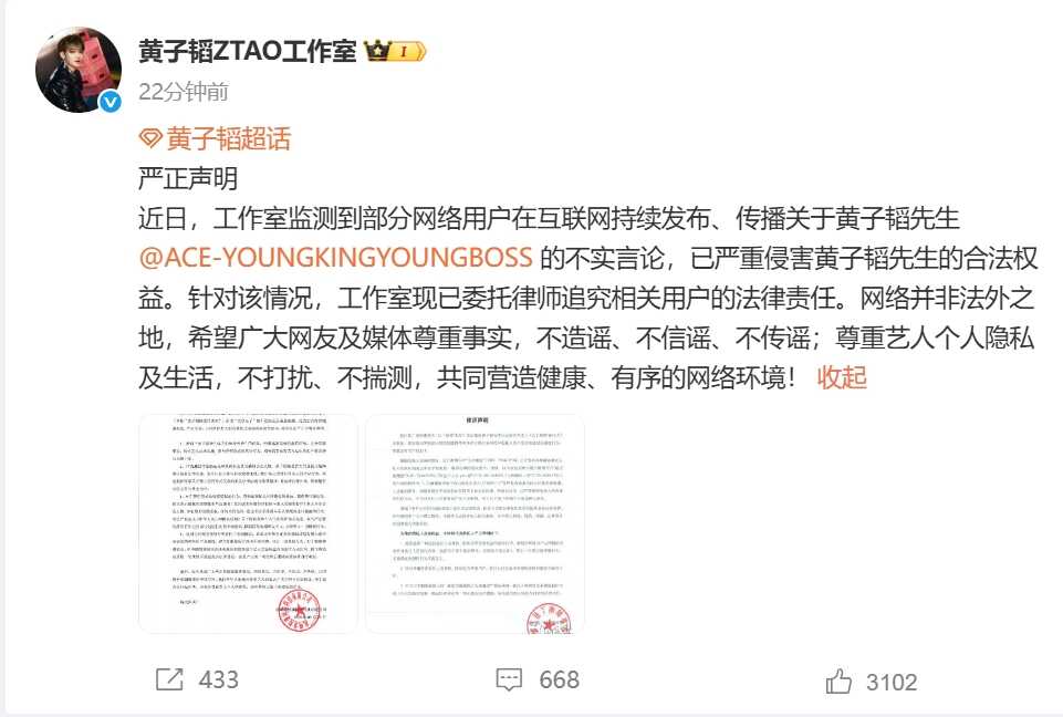6月25日,黄子韬工作室发布严正声明:近日,工作室监测到部分网络用户在互联网持续发布、传播关于黄子韬先生的不实言论,已严重侵害黄子韬先生的合法权益。针对该情况,工作室现已委托律师追究相关用户的法律责任。网络并非法外之地,希望广大网友及媒体尊重事实,不造谣、不信谣、不传谣;尊重艺人个人隐私及生活,不打扰、不揣测,共同营造健康、有序的网络环境!