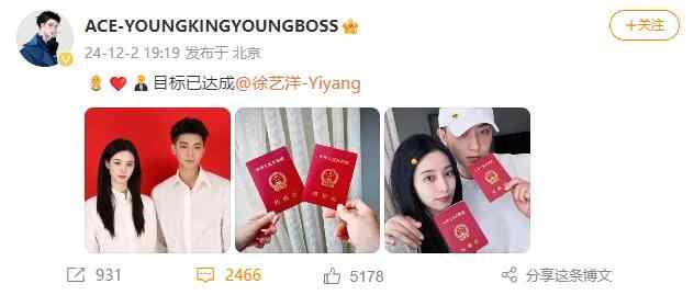 2024年12月2日,黄子韬发文官宣,已与徐艺洋领取结婚证。他配文称:“目标已达成。”