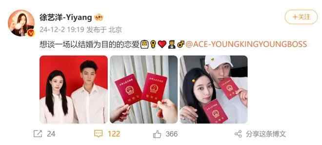 徐艺洋也在个人社交账号发文称:“想谈一场以结婚为目的的恋爱。”