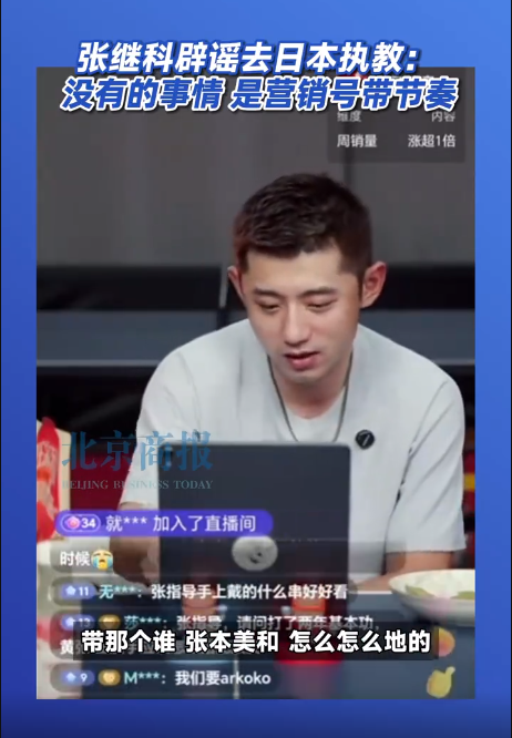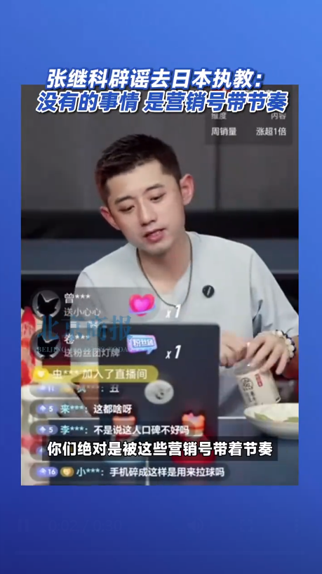 近日,张继科直播时表示:“网上说我要去日本执教,又说我没去,我没有听说过这消息。前两天还说我要去日本带张本美和。我都不知道这个事情,你们绝对是被营销号带节奏了。”