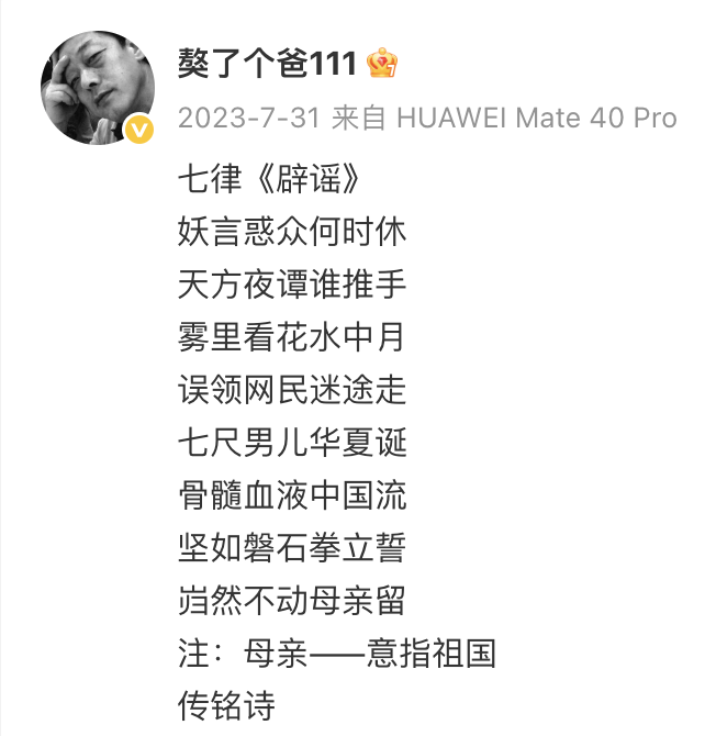 值得关注的是,2023年7月,就曾有消息称张继科将执教日本,张父曾写诗辟谣:“七尺男儿华夏诞,骨髓血液中国流,坚如磐石拳立誓,岿然不动母亲留。”