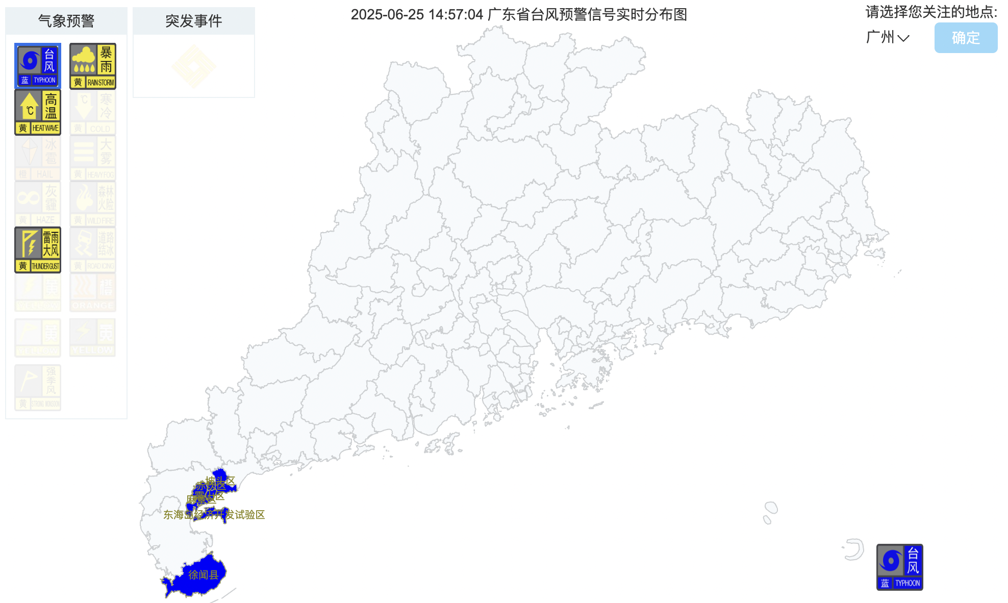 在热带低压生成后,广东雷州半岛一带市县,已跳过台风白色预警信号,率先发布更高一级的台风蓝色预警信号。