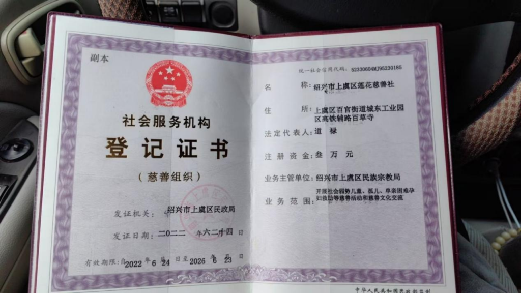 其社会服务机构登记证书载明,2022年6月,道禄作为法定代表人在上虞区民政局注册登记了民办非企业单位“绍兴市上虞区莲花慈善社”,业务范围是开展弱势儿童、孤儿、单亲困难孕妇救助等慈善活动和慈善文化交流。今年2月,上虞区民政局公示,莲花慈善社法定代表人由道禄变更为吴某某(道禄出家前与前妻所生女儿)。