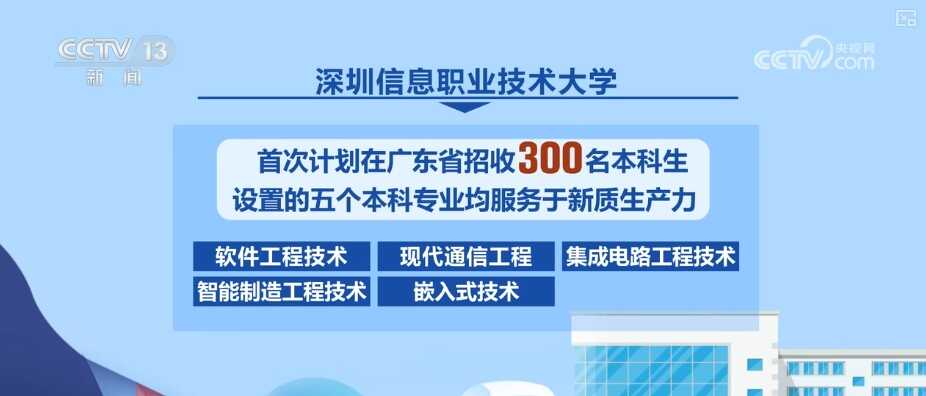位于深圳市龙岗区的深圳信息职业技术大学首次计划在广东省招收300名本科生,设置的5个本科专业:软件工程技术、现代通信工程、集成电路工程技术、智能制造工程技术、嵌入式技术均服务于新质生产力。