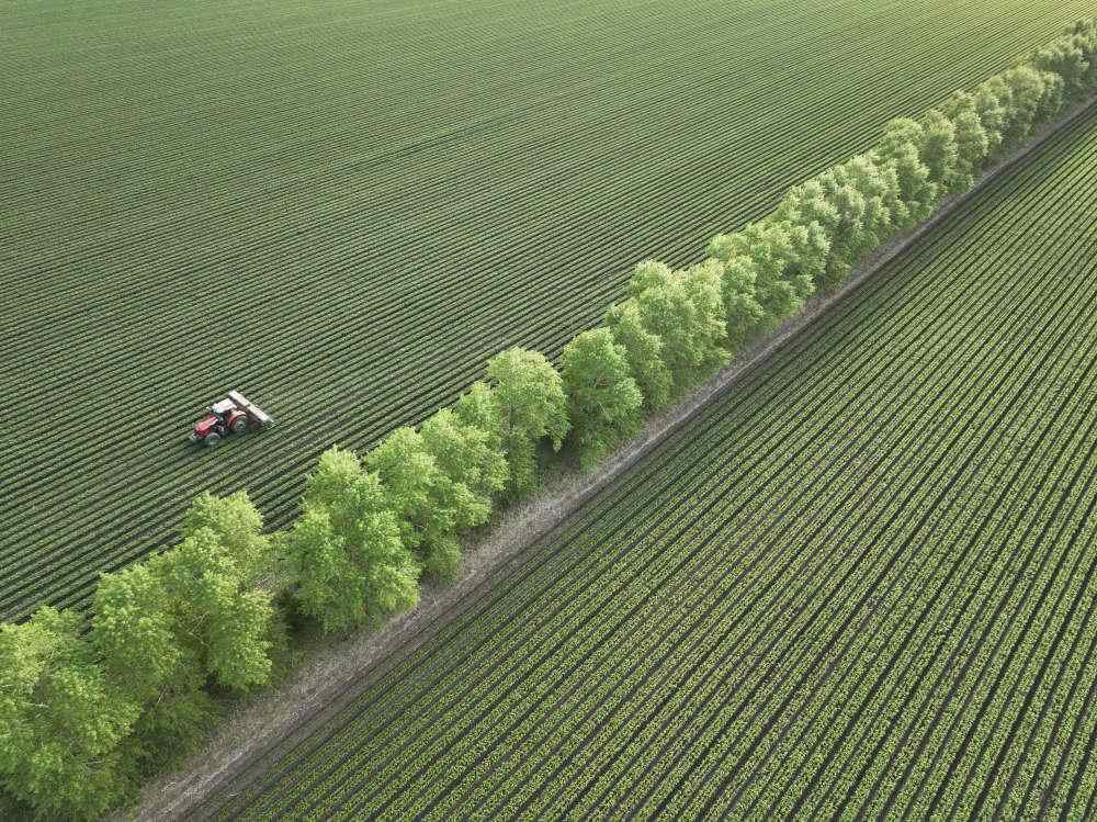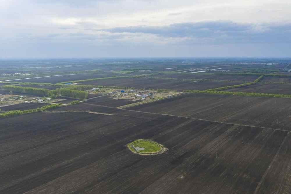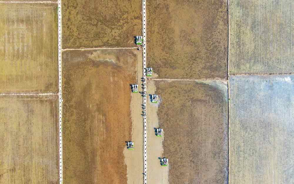 2024年6月25日,在黑龙江省北大荒集团鹤山农场第一管理区一大豆地块,大型机车在进行中耕作业,为土壤增温放寒(无人机照片)。