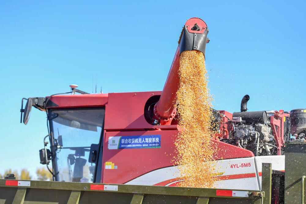 2023年10月19日,在中国科学院“黑土粮仓”科技会战长春示范区公主岭示范基地,无人驾驶农机将收获的玉米装车。