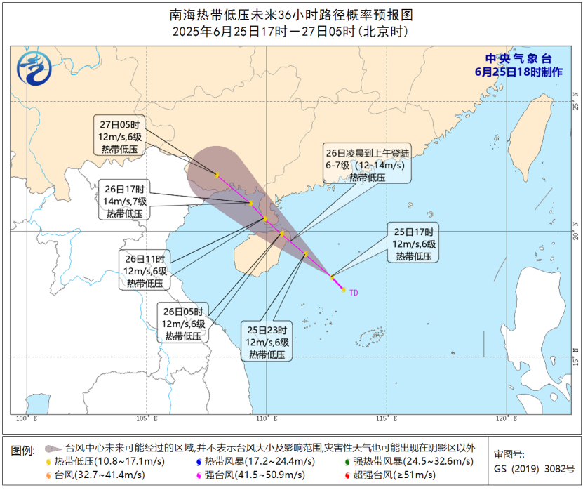 一个热带低压25日14时在南海中部形成。根据中央气象台、广东省气象台6月25日傍晚最新预计,该系统强度变化不大,很可能持续保持着热带低压强度,并在26日凌晨至上午时段登陆海南万宁到广东湛江沿海一带。广东省气象台预计,该热带低压将为广东局地带来最大200毫米的面上降水,请各地注意对风雨天气特别是局地强降水引发的灾害。