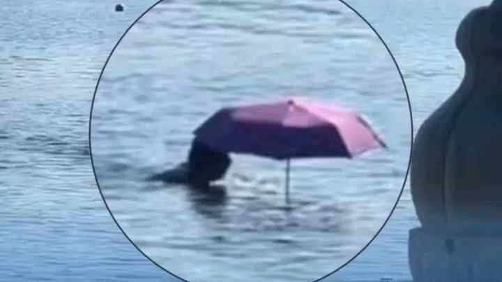 什刹海大爷解锁 "伞泳" 新姿势! 防晒游泳两不误 网友:这松弛感太绝了 来源#小羊拍客