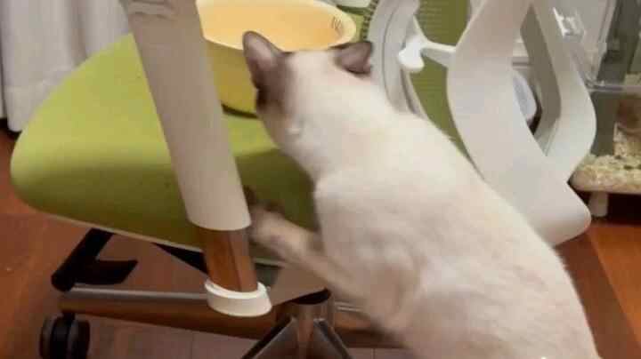 馋猫为吃竟围着椅子“拉磨”,椅子秒变旋转餐桌