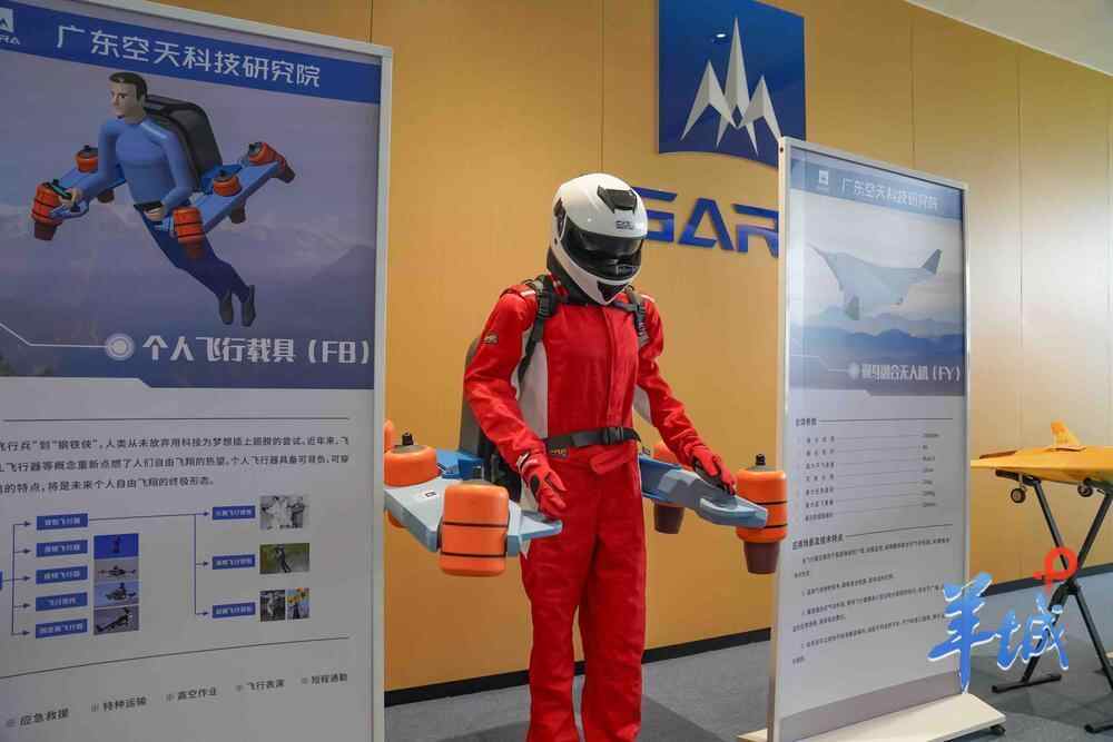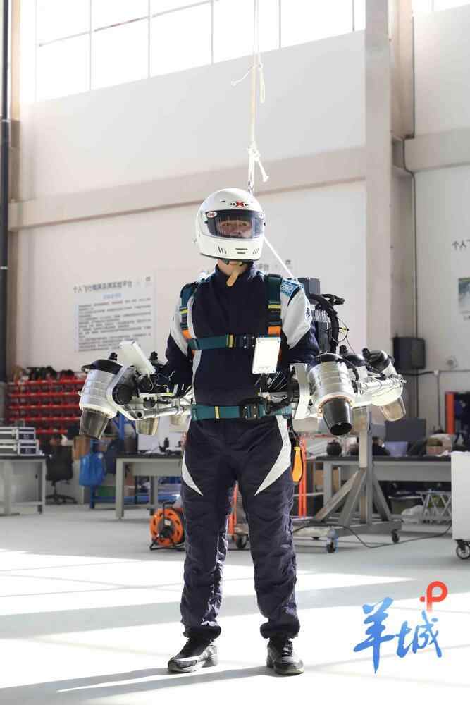 广空院飞行器总体设计师、飞行背包团队技术负责人陈旭智向羊城晚报记者展示了飞演大厅内陈列的单人喷气飞行背包,据称,只要穿戴这款飞行背包,就可以安全“上天”。