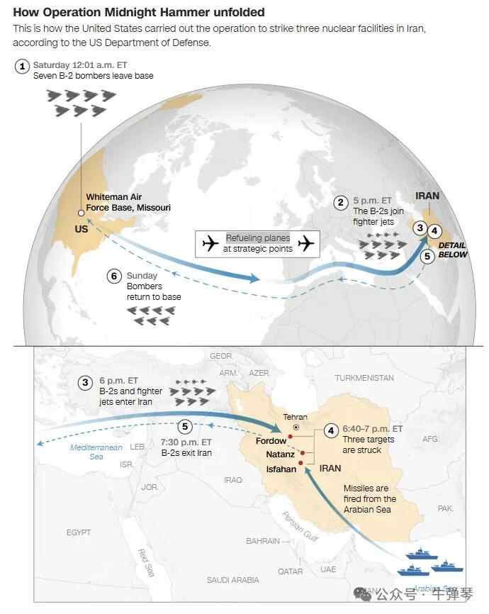 美军事后承认,所谓的6架B-2,完全是迷惑,就是在骗伊朗;事实上,7架B-2轰炸机,飞越的是大西洋,随即对伊朗三处核设施发动了攻击。