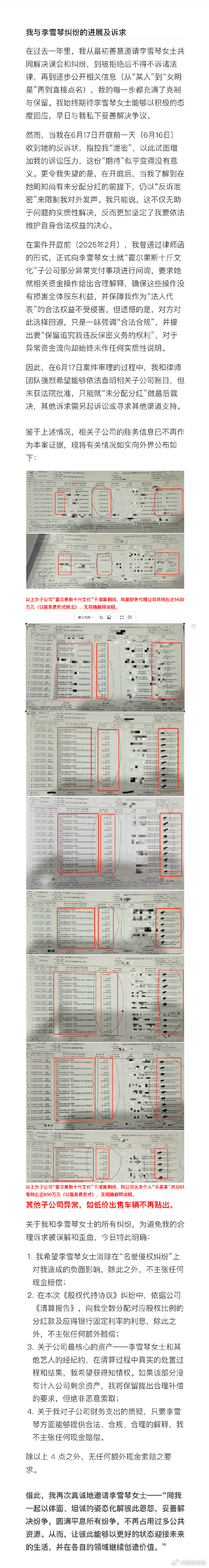 6月23日,网友@老谢同学之你谢哥发布微博,更新与李雪琴案件纠纷的进展及真实诉求,透露在开庭前一天收到李雪琴的反诉状,指控他“泄密”;其要求依法查明相关子公司账目,未获法院批准;现公开相关子公司账务信息,称清算期间,相关子公司以服务费形式转出约2000万,无明确解释说明;要求李雪琴消除“名誉侵权纠纷”上对他的负面影响、依据《清算报告》支付分红及利息、获得经纪约知情权等,除此,“无任何额外现金索赔支要求。”