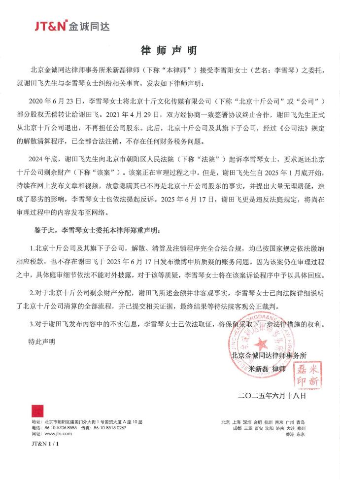 18日,@李雪琴工作室 回应称:严正声明,法院见。