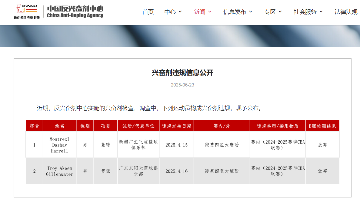 6月23日,中国反兴奋剂中心官网公开发布了两则兴奋剂违规信息。据信息显示,CBA联赛新疆男篮外援哈雷尔和广东男篮外援吉伦沃特在参加2024-2025赛季CBA联赛期间违规使用兴奋剂。