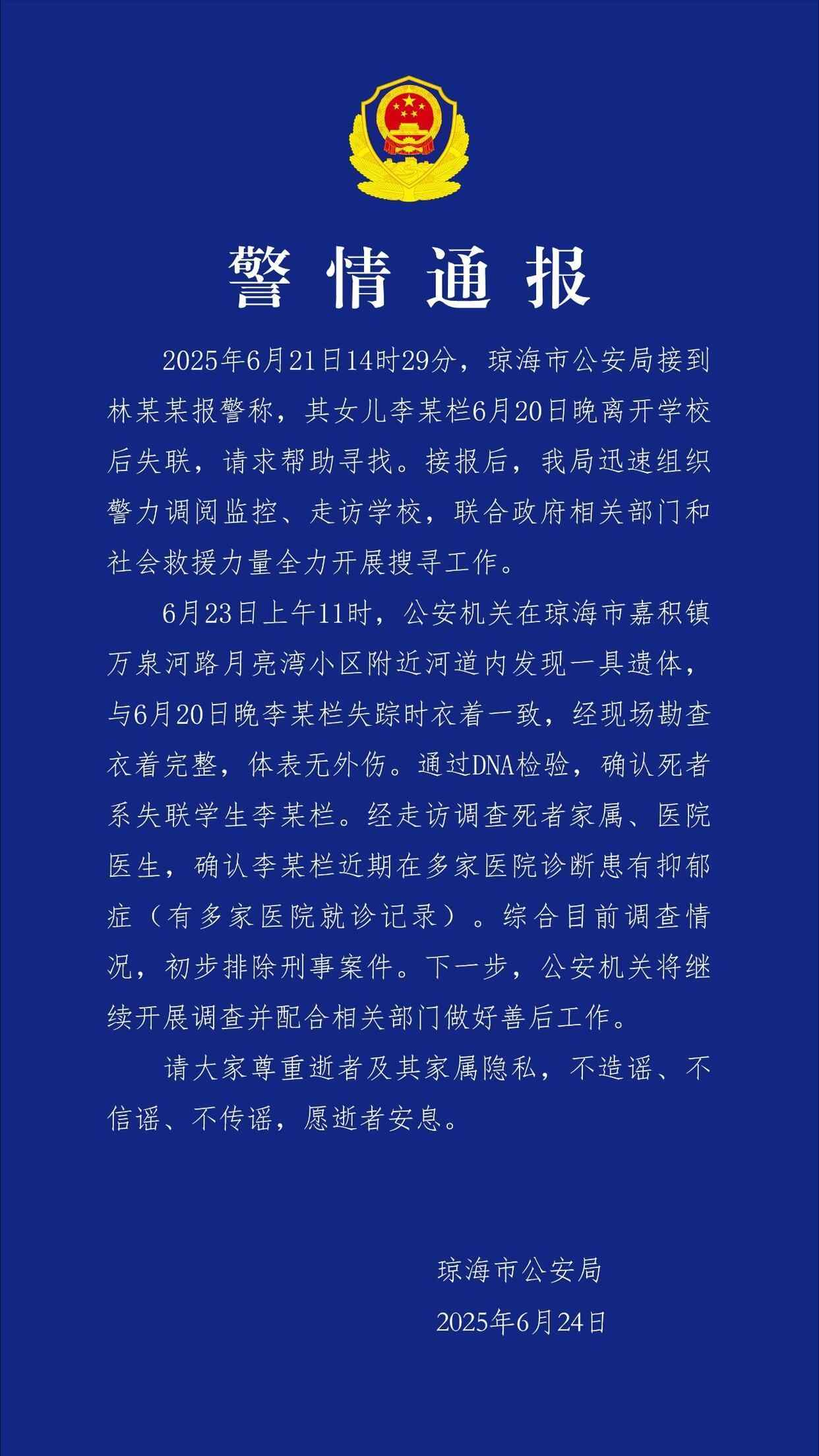 2025年6月21日14时29分,琼海市公安局接到林某某报警称,其女儿李某栏6月20日晚离开学校后失联,请求帮助寻找。接报后,琼海市公安局迅速组织警力调阅监控、走访学校,联合政府相关部门和社会救援力量全力开展搜寻工作。