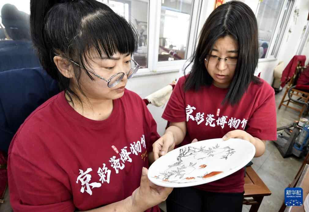 北京三级工艺美术大师、京彩瓷第五代传承人杨雪(右)在指导青年技师绘画(6月18日摄)。
