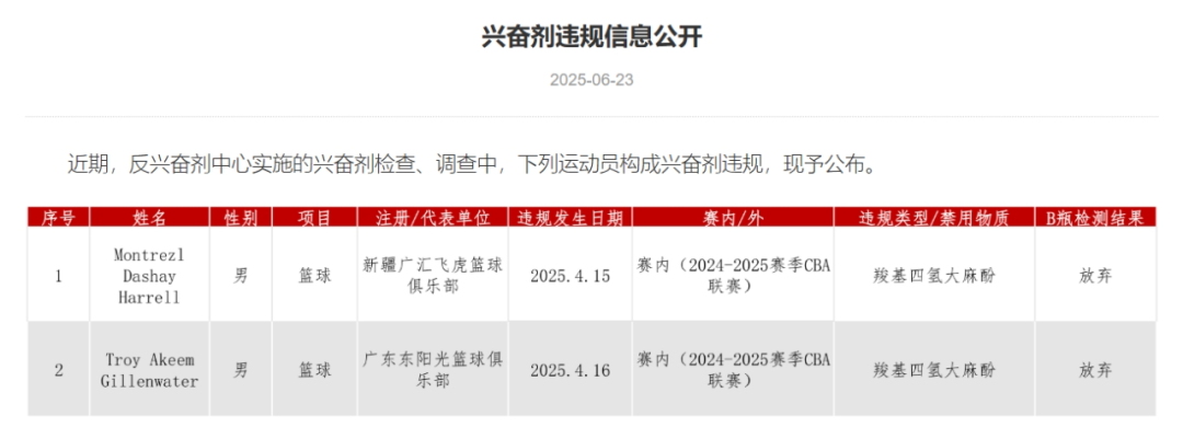 6月24日,据@中国篮球协会消息,中国篮协注意到中国反兴奋剂中心于6月23日发出的兴奋剂违规信息公开显示,在2025年4月由中篮联(北京)体育有限公司委托中国反兴奋剂中心进行的CBA联赛例行赛内兴奋剂检查中,CBA联赛中的外籍球员Montrezl Dashay Harrell和Troy Akeem Gillenwater构成兴奋剂违规。