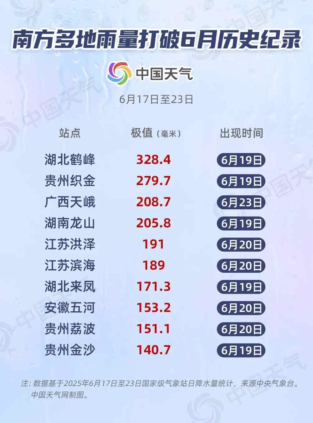 此次降雨不仅影响范围广,持续时间长,短时降雨强度也较强,多地打破单日降雨量历史纪录。中国天气网气象分析师沈雨旸介绍,6月17日至23日,湖北、安徽、湖南、贵州、广西、云南、山东、河南共有15个国家级气象观测站的单日降水量打破6月历史纪录,其中湖北鹤峰、贵州织金、广西天峨单日雨量超200毫米,突破全年降雨历史纪录。