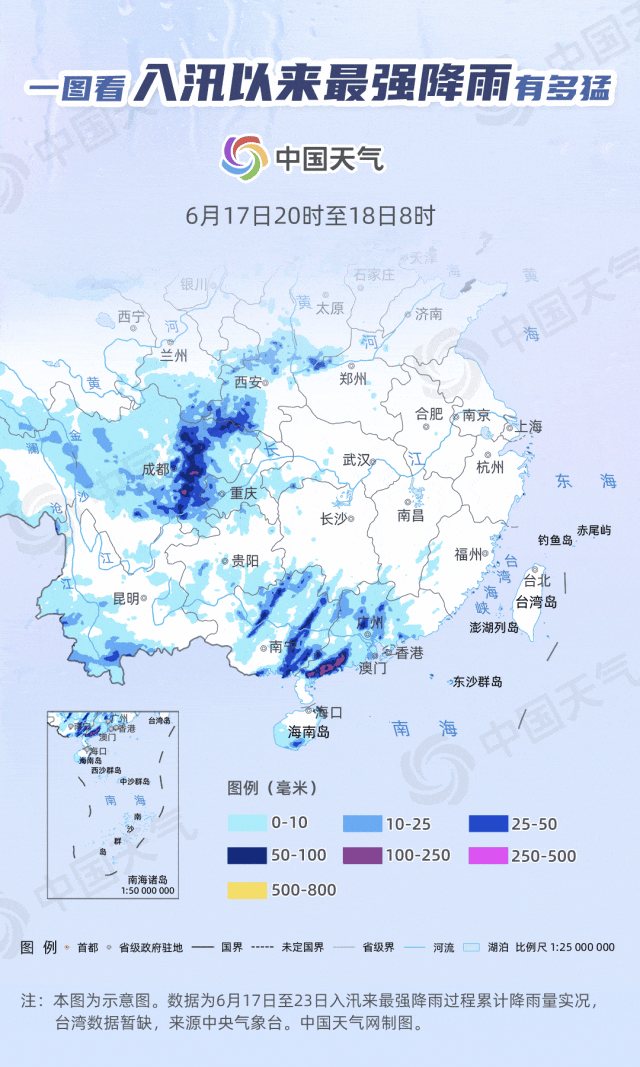 今年入汛以来,南方强降雨不断。6月17日至23日,入汛来最强降雨波及14省区市,多地单日雨量打破历史纪录。前一轮降雨刚刚结束,新一轮暴雨过程又接踵而至。入汛来最强降雨到底有多猛?哪里将成新一轮暴雨过程核心影响区域?为你解读。