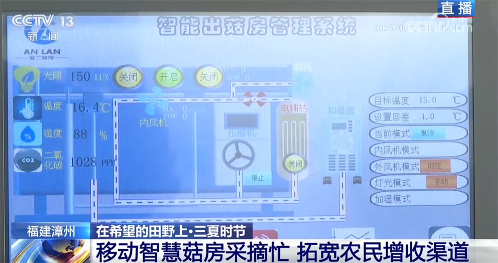 那“移动智慧菇房”的“智慧”又体现在哪儿呢?其实每个菇房都装有自动控制系统,只要在这个面板上设置自动控制模式,菇房就可以对不同生长阶段的菌菇所需的光照、温度、湿度、二氧化碳浓度等参数自动调节。