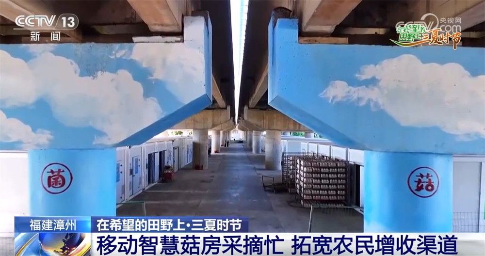 记者正在漳州市芗城区天宝镇的百米菌菇示范基地。通过航拍画面,我们可以看到周围的环境,这里在田寮村村口的一个高速高架桥下,两边是农田和住宅,桥下形成了闲置的空地。2023年开始,当地利用这块空地建设起了“移动智慧菇房”,它们每个长8米、宽3米、高2.4米,外观看上去就像是一个个集装箱,可以整箱吊装移动。在周边村落房前屋后的闲置空地上,也能够看到这些移动菇房的身影。